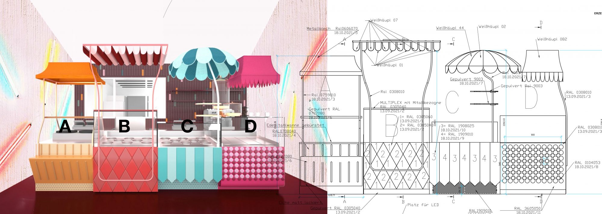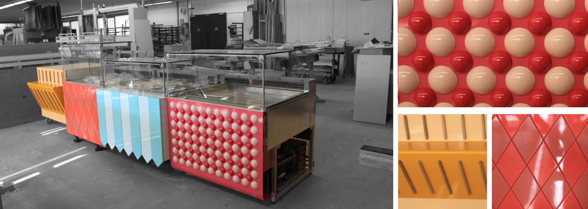 Für das Hotel „Karl August“ und unserem Stammkunden die „alpha Gruppe“ realisieren wir gerade einen weiteren Bereich. Mit viel Spaß konnten wir die letzten Wochen die Entwürfe von Slavis Poczebutas aus Berlin realisieren. In der Theke bildet pulverbeschichtetes Metall, hochglanzlackierte MDF Flächen, abgerundete Eichesticks und 3D gedruckte Kunststoffhalbkugeln eine „Eis Collage“ aus Farben und Formen – Es entsteht eine Eistheke mit Alleinstellungsmerkmal.