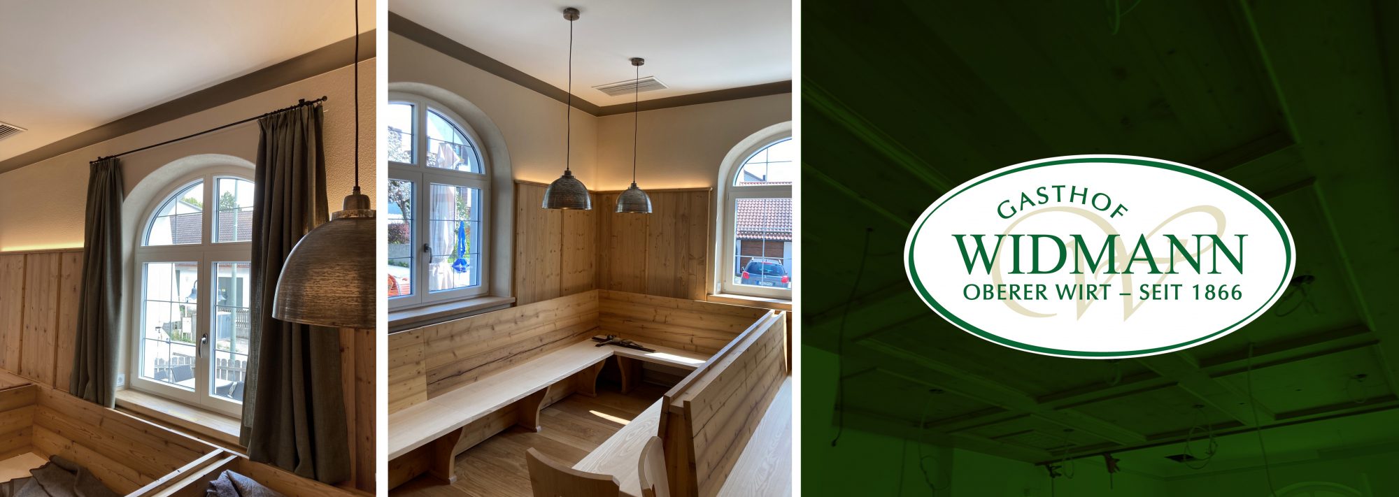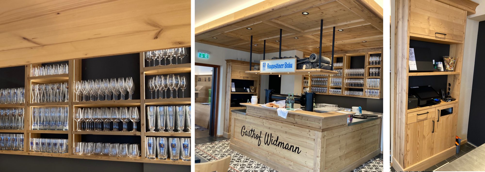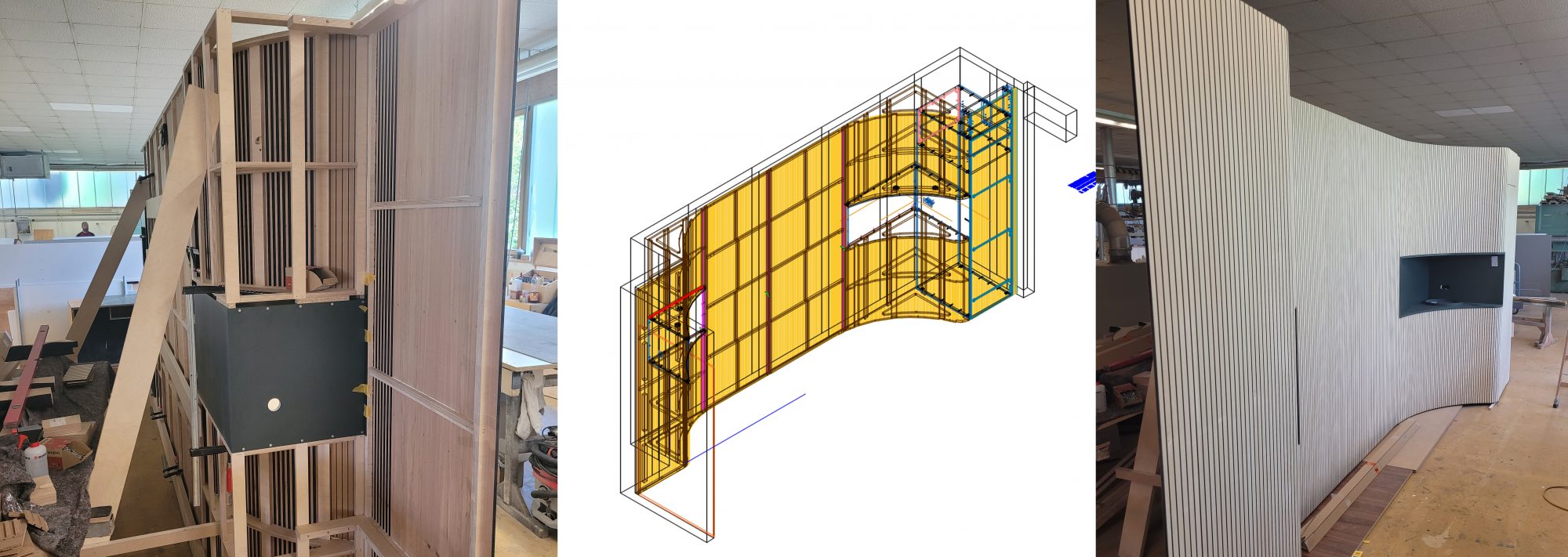 Bevor die Wandverkleidung im Konferenzbereich im Hotel Grüner Baum in Kühnhofen montiert wird ist sie schon zweimal aufgebaut. Einmal als 3D Modell am PC und einmal als Möbel in unserer Werkstatt.
