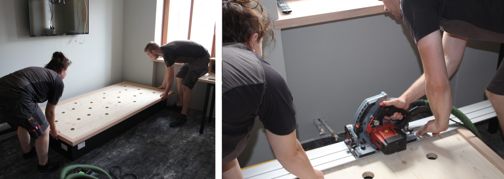 Im 2. OG steht noch unsere Werkzeugkiste und fügt sich auf den ersten Blick in das Zimmer wie ein Stück Deko ein, doch hier gibt es noch einiges zu tun. Die letzten Daybeds werden an die Bestandswände angepasst und die Schiebetürblenden wurden heute montiert. Bald können auch hier die ersten Gäste schlafen.