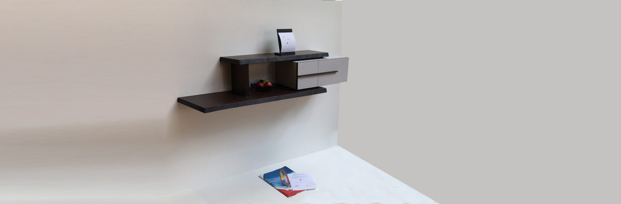 Das an der Wand hängende Sideboard besteht aus einem mit grauem FENIX-Schichtstoff belegtem Korpus, der von einer Spange aus massiver Räuchereiche umfasst wird. Die Türe sowie die Schubkastenfronten sind durch Griffe aus Räuchereiche zu öffnen. Zur Beleuchtung des Möbels befindet sich in der oberen Diele der Spange ein LED-Spot.