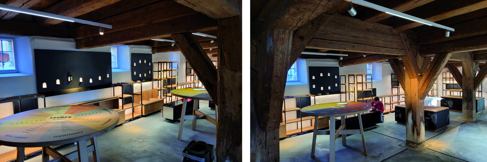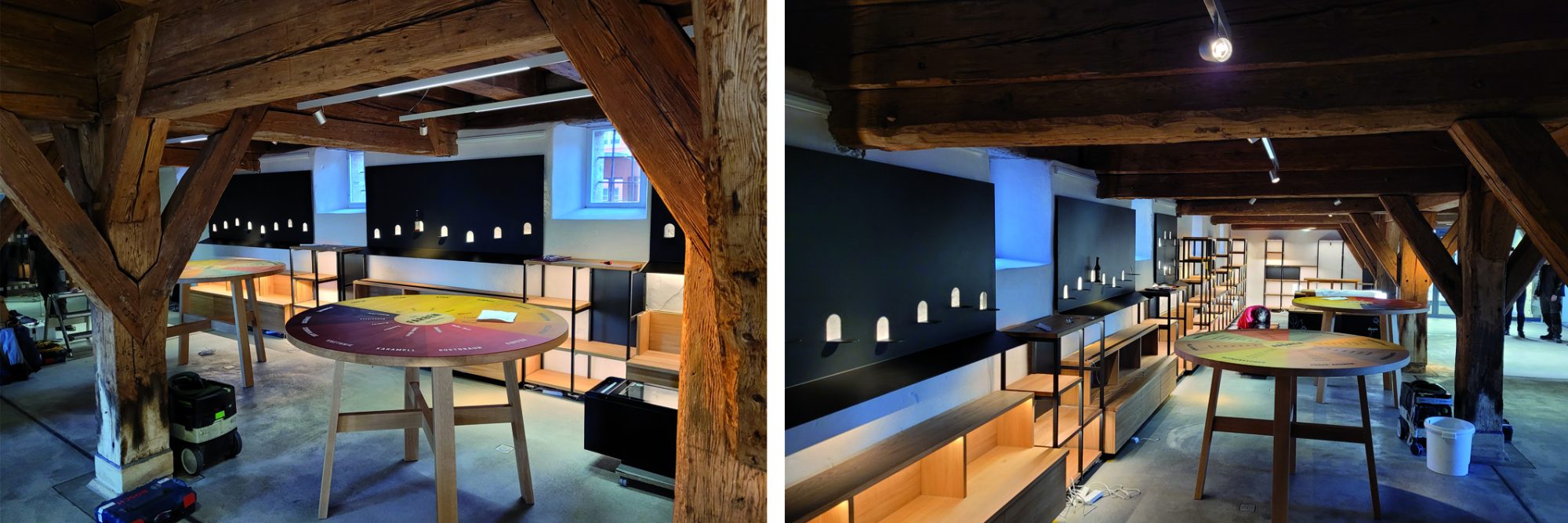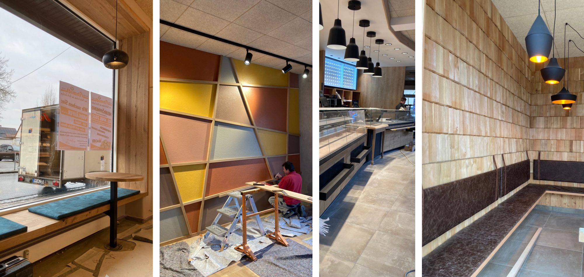 Der Entwurf mit dem Materialkonzept ist vor einigen Wochen auf unseren Tischen entstanden und jetzt sind schon die ersten Deckenelemente montiert und Böden verlegt. Im Thekenbereich wird mit einer historischen Via Zementfliese gearbeitet – im Sitzbereich kommt ein Massivholzboden in Eiche zum Einsatz. Die Einrichtung wird eine Kombination aus Fichte Altholz und matt schwarzen Elementen.