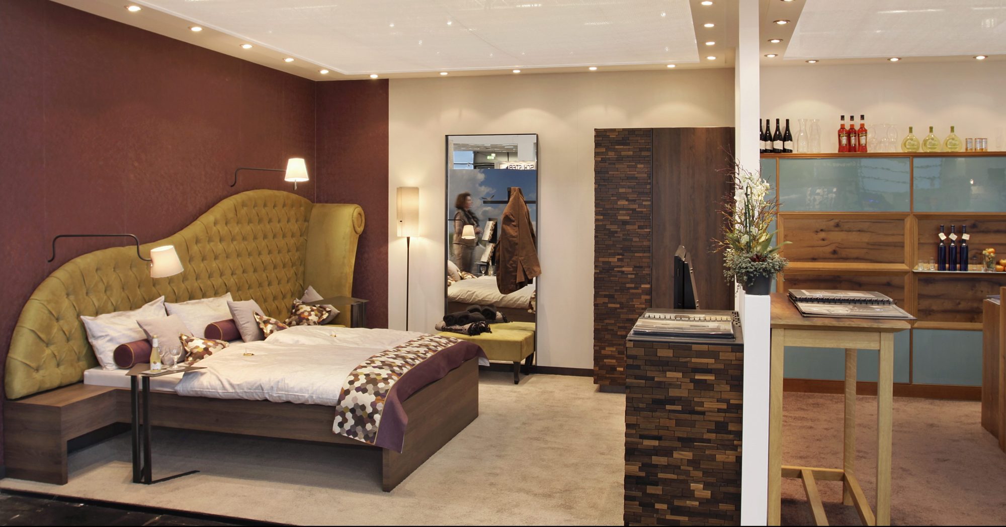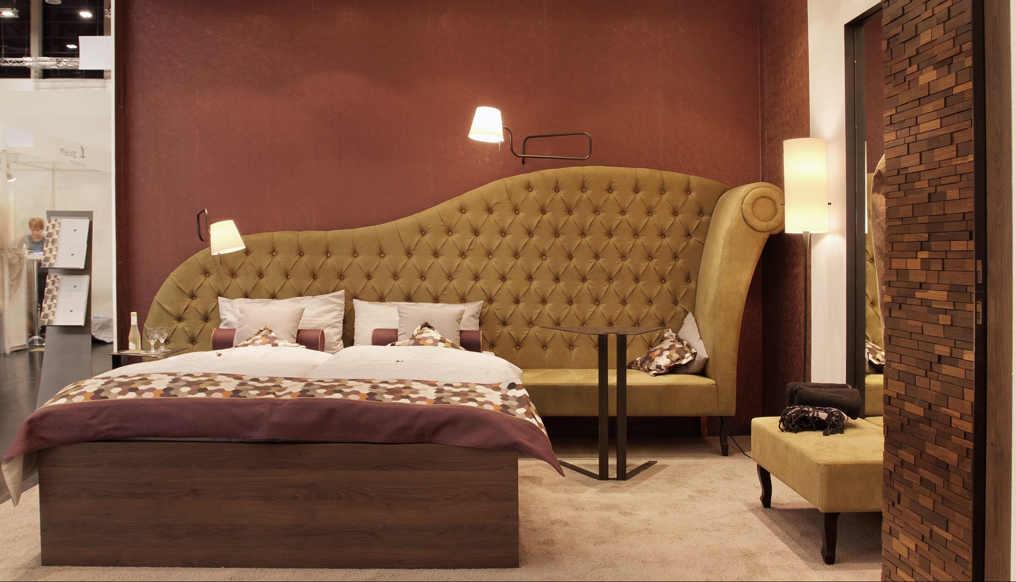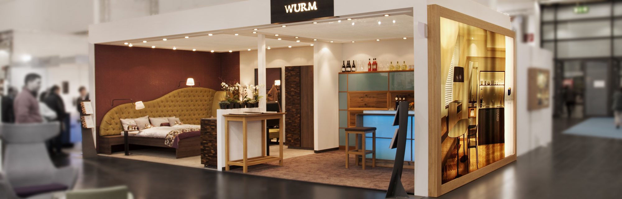 Auf unserem Stand werden zwei Szenerien abgebildet sein: ein mondänes Bett-Sofa bildet den Mittelpunkt eines Hotelzimmers, das auf kleinem Raum maximalen Komfort bietet. Eine beleuchtete Bartheke impliziert eine Gastro-Szenerie.